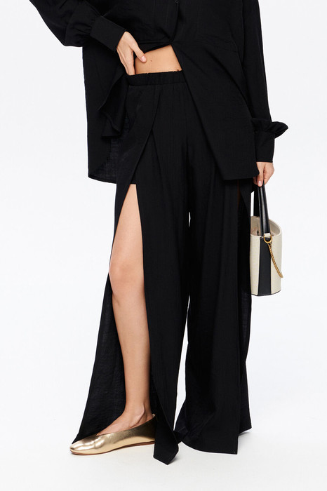 Детали: эластичный пояс, высокие разрезы, без застежки, без карманов, брюки на подкладке из основной ткани.