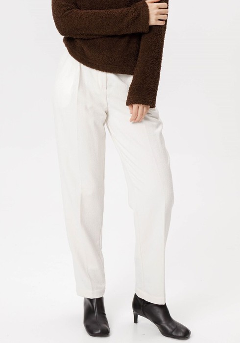 Детали: брюки с притачным поясом со шлевками, передние половины с застроченными мягкими складками и заутюженными стрелками, застежка на молнию и пуговицу, боковые карманы. Задние части брюк с вытачками и заутюженными стрелками. Пояс брюк без резинки.