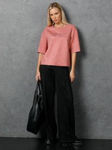 Модель прямого силуэта, на притачном поясе с резиной. Спереди средние швы обработаны с открытым срезом. В подрезных бочках карманы. Застёжка на молнию и пуговицы на поясе. Сади накладные карманы с открытыми срезами.