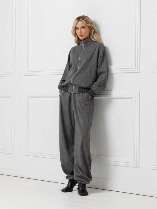 Модель свободного кроя, к низу чуть заужена, на эластичном поясе, со шлёвками. В кулису на поясе вставлен шнурок с наконечниками. Спереди прорезные карманы с листочкой. Сзади накладные карманы. По низу брюк застрочены вытачки. Ширина по низу регулируется резинкой и фиксаторами, создавая разный силуэт.