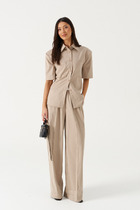 Брюки женские из плотного и мягкого хлопкового трикотажного полотна с изнаночным начесом. Карманы прорезные с листочками и молниями. Пояс брюк и манжеты из эластичного трикотажного полотна рибана. Пояс по линии талии регулируется шнуром.