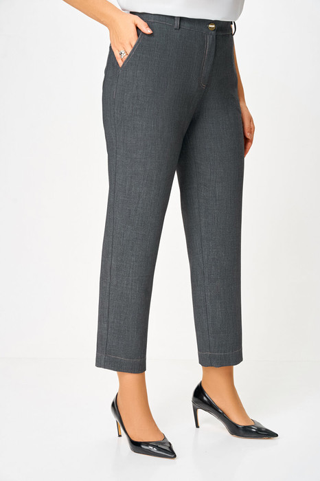 Брюки из мягкой эластичной ткани под джинс, прямого силуэта, заужены к низу. Спереди боковые функциональные карманы, сзади накладные фигурные карманы с двойной контрастной отстрочкой. Пояс притачной с эластичной тесьмой-резинкой по спинке и шлёвками для пояса. Застёжка на тесьму-молнию, петлю и джинсовую пуговицу на поясе.
