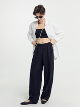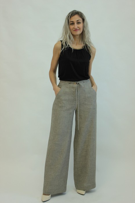 Брюки прямые свободного кроя с накладными карманами. . Притачной пояс с кулиской. Посадка средняя. Длина изделия по боковому шву 110 см, по шаговому шву 82 см.