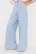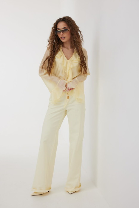 Джинсы с высокой посадкой прямого силуэта. Застежка на петли и декоративные пуговицы. По переду карманы, сзади накладные карманы. По швам контрастная отделочная строчка.