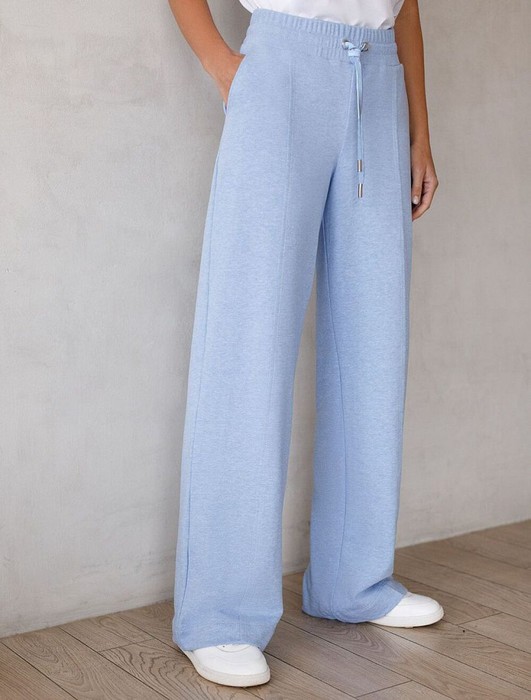 Брюки прямого кроя с удобным эластичным поясом на резинке и карманами по бокам выполнены из премиального футера-двухнитки. Наличие эластана в составе гарантирует комфорт и долговечность изделия, материал хорошо пропускает воздух, позволяя телу дышать.. Эти уютные брюки нежного цвета макиато с эффектом меланж созданы для вашего комфорта. Свободный прямой крой обеспечивает свободу движений и максимальное удобство в любых ситуациях, поэтому они подойдут и на большие размеры, а так же на высокий или низкий рост. Фигура подчеркивается, а силуэт визуально вытягивается за счет кроя палаццо и застроченных декоративных стрелок. Вы можете создать стильный образ на каждый день в сочетании с джемпером D49.139 и бомбером D49.141. В повседневных трикотажных брюках вы будете чувствовать себя комфортно и уверенно, наслаждаясь каждым моментом дня.