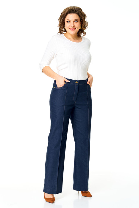 Брюки прямого силуэта с центральной застёжкой на молнию и петлю-пуговицу. По передним половинкам застрочены канты.В боковых швах карманы с отрезным бочком.Задние половинки с отрезными кокетками и накладными карманами. Застежка спереди на молнию и пуговицу. Пояс притачной с резинками по бокам. Отделочные строчки контрастного цвета.