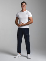 Брюки мужские с карманами на молнии, на замках молний висит брелок. Ткань в рисунок, под карманом надпись - наклейка. Брюки на манжете, пояс со шнурком