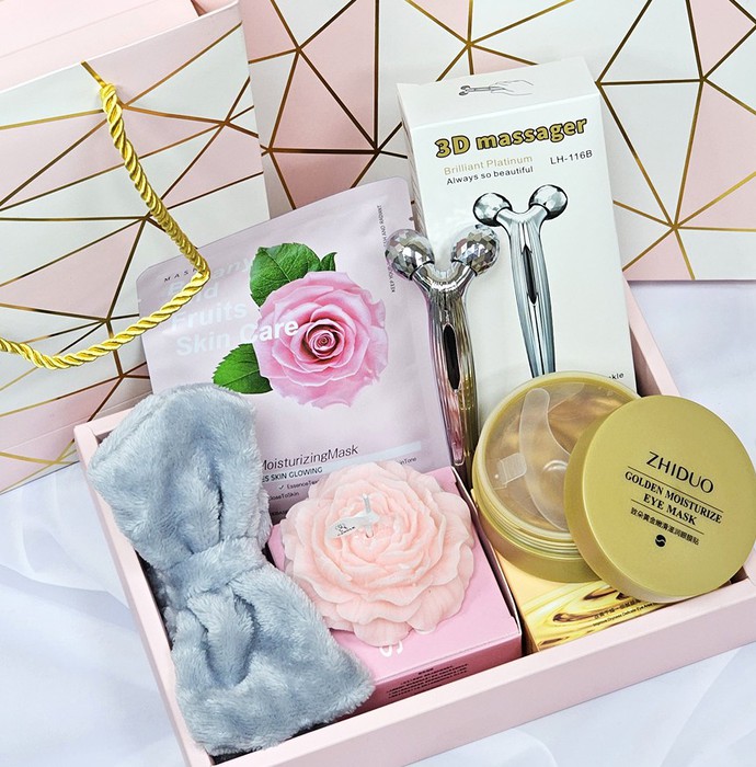 В состав набора входят:, 1. Гидрогелевые патчи для глаз с золотом Zhiduo, 60 шт., 2. Лифтинг-массажер для лица и тела 3D Massager, 3. Ароматическая свеча в подарочной коробке "ПИОН", 4. Тканевая маска для лица (Случайный вид из имеющихся на складе), 5. Косметическая повязка-бант серая, 6. Коробка подарочная + Подарочный пакет