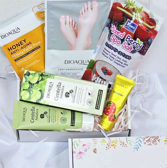 В состав набора входят:, 1. Тайский скраб Ягоды или АЛОЭ или Парфюмированный с Розой 300 гр., 2. Пенка для умывания с центеллой Bioaqua, 100 гр., 3. Маска-носочки для ног с маслом авокадо BioAqua, 1 пара.4. Маска для лица тканевая с медом BioAqua5. Крем для рук с земляникой, 30 гр., 6. Коробка подарочная с рисунком из плотного картона размером 15*20 см. + бумажная стружка декоративная