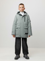 Ткань верха поликоттон пропитка верха от дождя, подклад полиэстер, утеплитель синтетический пух, капюшон сьемный, ворот на флисе, два кармана наружных (клапаны), один карман на рукаве (молния), один карман внутренний.
