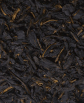 Чайный лист темного цвета, относительно крупный и скрученный не очень плотно.