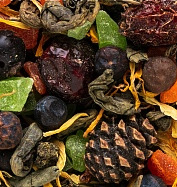 Зеленый байховый Ганпаудер, календула, цукаты папайя, сублимированная смородина, кусочки сушеной клубники, цукаты ананаса, шиповник, лист смородины, еловые шишки, арома. масла