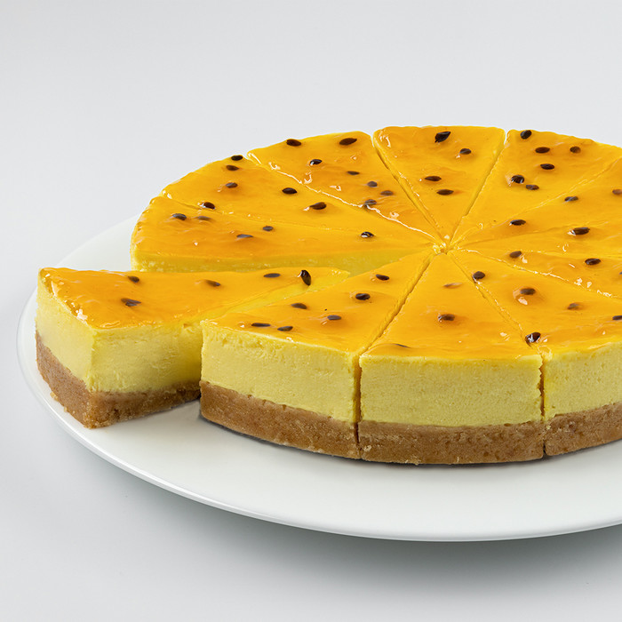 Сливочный чизкейк на основе коржа из песочного печенья и нежной творожной массы со вкусом манго, покрытой глянцевым топпингом из сочной маракуйи.
