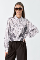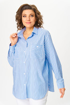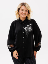 Блузка среднего объема из текстильного полотна штапель, отложной воротник со стойкой. Цельнокроеная планка с застежкой на пуговицы. Втачной длинный рукав с притачным манжетом и застежкой на пуговицы. Низ прямой, по бокам разрезы.