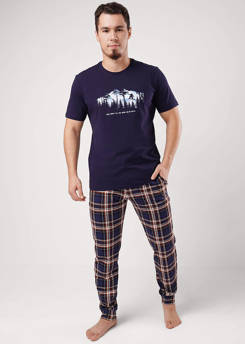Мужские домашние брюки на манжете из хлопковой кулирной глади с карбоном в клетку. Мягкие и комфортные, прекрасно держат форму и не сковывают движений. Отличное решение для создания стильного образа на каждый день.