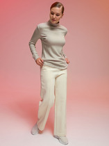 Брюки прямого кроя из эластичного футера. Притачной пояс с резинкой, боковые карманы с отрезным бочком.