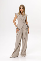 Брюки зауженные из текстильного полотна габардин с добавлением вискозы. Притачной пояс со шлевками, гульфиком и застежкой на молнию, крючок. Боковые карманы с отрезным бочком. По спинке пояс на резинке. Заутюженные стрелки.