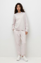 Брюки спортивные из трикотажного полотна футер с начесом,зауженные книзу. По талии пояс на резинке и внутренним шнуром. По низу брюк подгибка с внутренней резинкой. Боковые карманы с отрезным бочком.