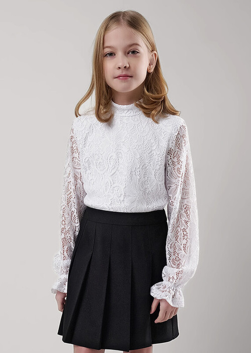 Стильная блузка из кружева станет отличным дополнением к вашему гардеробу! Модель с воротником стойкой дополнена длинными объёмными рукавами с резинкой по низу. Блузка отлично подойдет для создания повседневных и школьных образов!