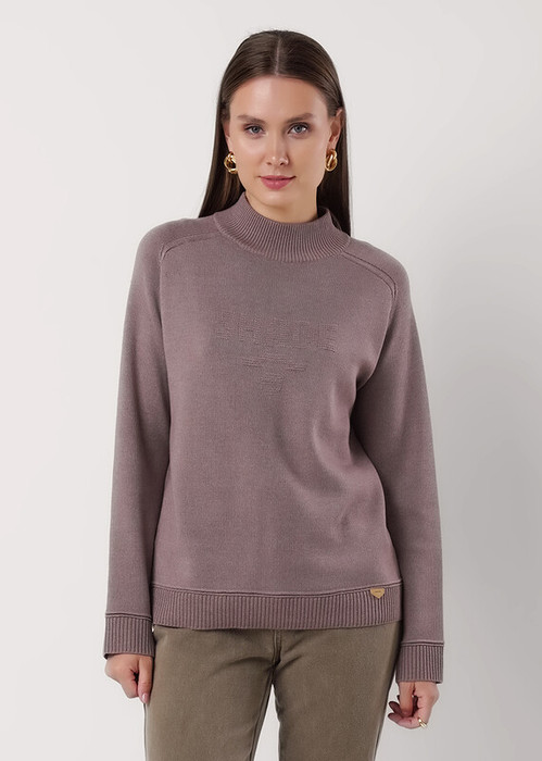 Вязаный джемпер прямого силуэта из хлопковой пряжи с добавлением акрила, переплетения гладь. Длинный рукав реглан. Округлая горловина с воротником стойкой. По низу изделия и рукавов манжеты. Спереди вывязан рисунок, внизу нашивка.
