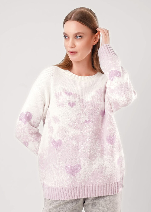 Вязаный джемпер умеренного объема жаккардового переплетения из акриловой пряжи. Спущенный длинный рукав, округлая горловина с бейкой. По низу изделия и рукавов манжеты.