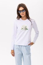 Вязаный джемпер прямого силуэта из вискозной пряжи с добавлением нейлона, ажурного переплетения. Короткий втачной рукав. Округлая горловина с бейкой. По низу изделия и рукава сдвоенная гладь.