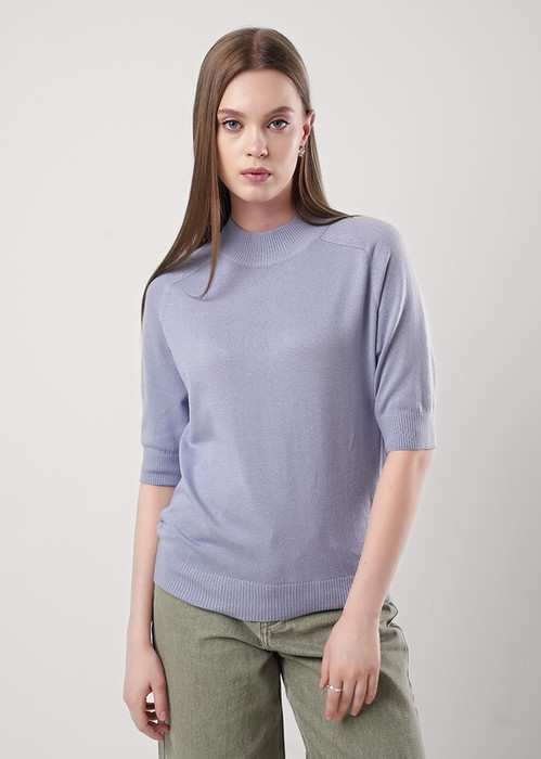 Вязаный джемпер прямого силуэта акриловой пряжи с добавлением хлопка, переплетение гладь. Короткий рукав реглан. Округлая горловина с полустойкой. По низу изделия и рукавов манжеты.