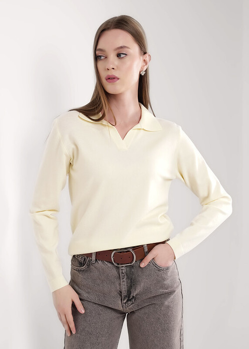 Вязаный джемпер свободного силуэта из вискозной пряжи, переплетения гладь. Втачной длинный рукав. По горловине отложной воротник с V-образной планкой. По низу изделия и рукавов узкие манжеты. Спереди нашивка металл.