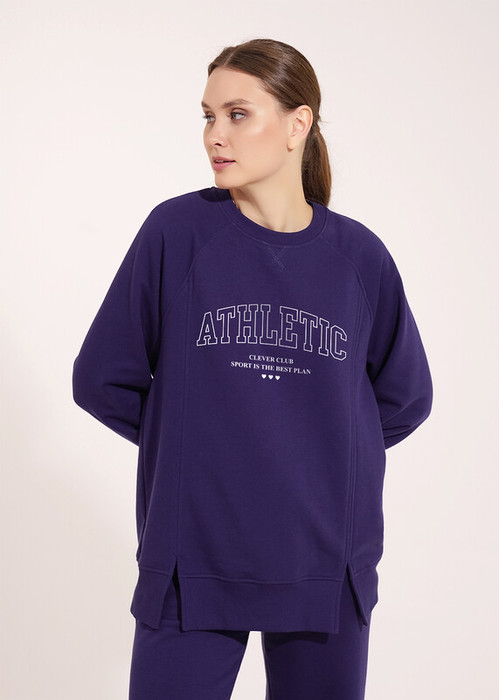 Джемпер спортивный из трикотажного полотна футер, свободного кроя. Округлая горловина с обтачкой. По переду резы с разрезами. Длинный рукав реглан, внизу нашивка. По низу рукава и изделия манжеты. Спереди принт.