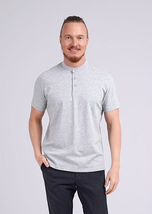 Футболка-поло с воротником-стойка и функциональной планкой на пуговицах, из смесового полотна. Составит отличный комплект с брюками для школы и офиса.