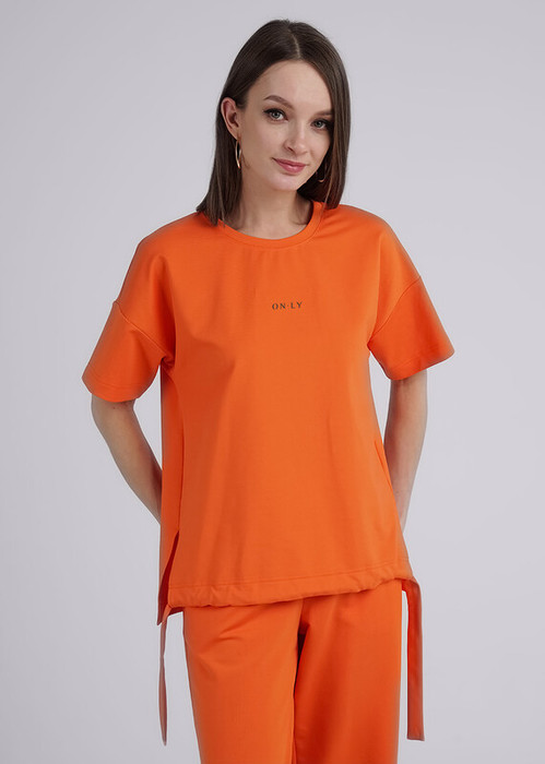 Джемпер из трикотажного полотна футер 2-х нит. Свободного силуэта, длиной до бедер. Спущенный короткий рукав. Округлая горловина с обтачкой. По низу переда кулиса с вытачным поясом, по бокам разрезы. Спереди принт.