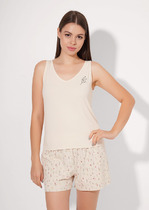 Футболка для дома и отдыха прямого силуэта из хлопкового трикотажного полотна интерлок. Округлая горловина с обтачкой из кашкорсе. Короткий рукав со спущенной линией плеча. На детали переда принт, нашивка.