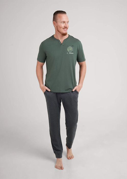 Комплект мужской состоящий из футболки и брюк. Футболка из трикотажного полотна с коротким рукавом и фигурной горловиной, спереди авторский принт. Брюки из трикотажа с набивкой на широком поясе с резинкой и регулируемым шнуром, по бокам удобные карманы.