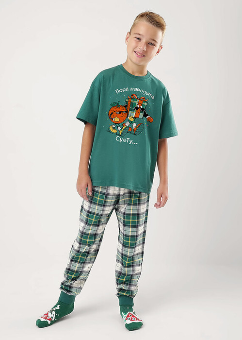 Новогодняя пижама для мальчика-подростка, состоящая из футболки и брюк. Футболка свободного кроя, с оригинальным тематическим принтом. Брюки среднего объема в клетку дополнены манжетами, которые обеспечат комфорт и идеальную посадку