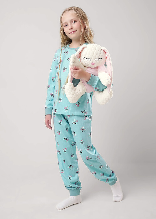 Комплект хлопковой пижамы из джемпера и брюк. Джемпер свободного кроя дополнен эластичной горловиной и манжетами. Брюки среднего объема, эластичный пояс и манжеты обеспечат комфорт и идеальную посадку, а стильная набивка подарит хорошее настроение.