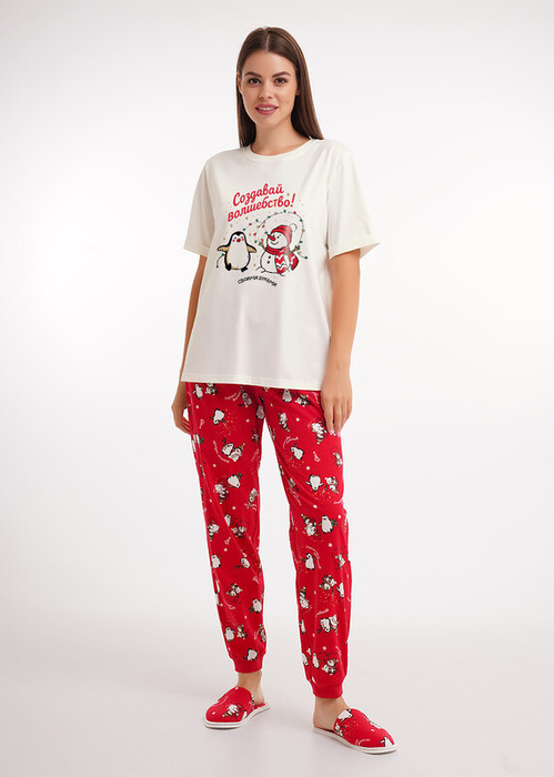 Набор одежды из трикотажного полотна.Футболка прямого кроя. Короткий втачной рукав с отворотом и закрепкой. По горловине обтачка.Спереди принт с помпоном, вшивка в боковом шве.Брюки с поясом на резинке.Боковые карманы с отрезным бочком.Внизу брюк манжет.