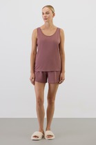 Брюки прямые для дома из трикотажного полотна. Притачной пояс на резинке и тесьмой. Боковые карманы с отрезным бочком, закрепление мешковины швом с застилом.