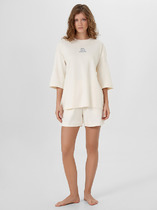 Набор одежды из трикотажного вискозного полотна кашкорсе. Футболка прямого кроя, короткий втачной рукав, округлая горловина с обтачкой. На полочке нашивка. Брюки прямые с внутренней резинкой и кулисой. По низу футболки, рукавов и брюк мелкий оверлок.