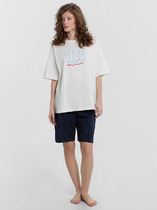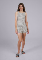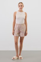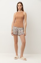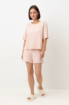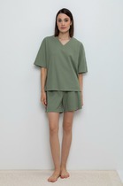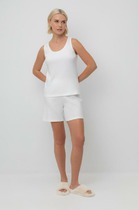 Пижама для дома из хлопкового трикотажного полотна. Майка прямого силуэта, на узких бретелях. По горловине и пройме окантовка. Короткие шорты свободного кроя, цельнокроеный пояс на внутренней резинке.