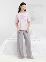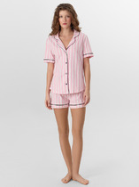 Пижама для дома из хлопкового трикотажного полотна. Майка на узких бретелях. По горловине переда обтачка с кружевом, бант.Отрезной лиф со сборкой. По пройме окантовка. По низу изделия мелкий оверлок. Короткие шорты с поясом на резинке. По низу шорт рюша.