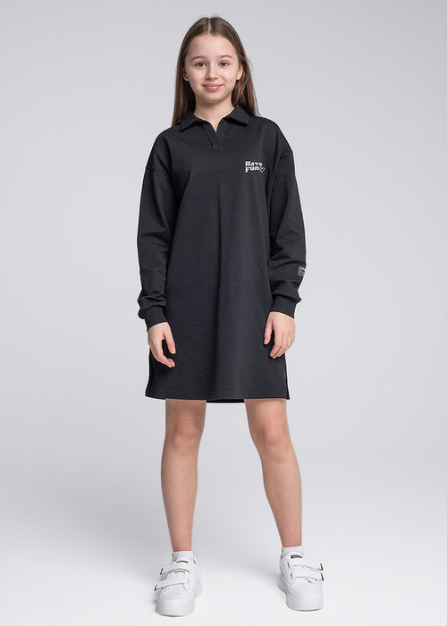 Платье с воротником поло из футера - то, что нужно для трендового образа. Дополните его любимыми кедами - образ на каждый день готов! Прямой силуэт, умеренный объем и эластичные манжеты подарят комфорт. Модель украшена минималистичным принтом.
