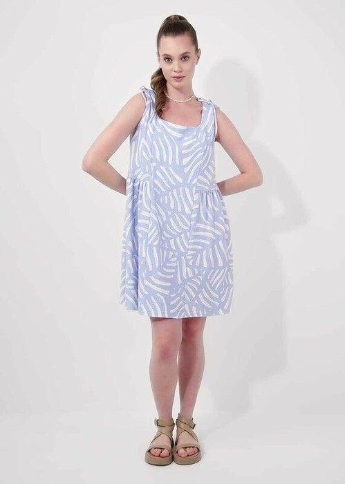 Платье без рукавов из фактурного трикотажного полотна джерси, длиной ниже колена. По горловине и пройме внутренняя окантовка. Отрезное по линии талии, боковые вставки со сборкой. По плечу завязки из окантовки. По спинке средний шов.