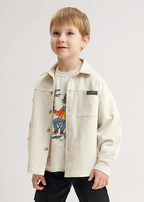 Уютная рубашка для мальчика из мягкого футера. Стильный накладной карман украшен декоративной нашивкой, добавляющей изделию индивидуальности. Комфортная посадка и современный дизайн делают эту модель идеальной для повседневной носки.