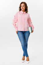 Блузка прямого силуэта из трикотажного полотна, с отложным воротником на стойке. Спереди цельнокроеная планка с застежкой на пуговицы. Длинный втачной рукав, внизу с притачной манжетой и застежкой на пуговицу. По спинке кокетка со складкой.