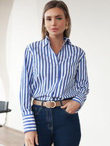 Блузка из текстильного полотна поплин, прямого силуэта на пуговицах с отложным воротником. По борту планка с пуговицами, по спинке кокетка. Длинный рукав со спущенной линией плеча. По низу рукава притачной манжет с пуговицей. Низ изделия фигурный.