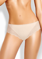 Трусы бикини женские из эластичного хлопкового полотна. По переду рез с кружевными боковыми вставками. Обработка краев по талии ажурная резинка (точечный зигзаг).