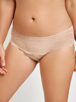 Бикини комфортной посадки с комбинированной спинкой. По поясу и ножке со стороны переда обработка резинкой с фестоном. На детали переда - небольшой атласный бант.