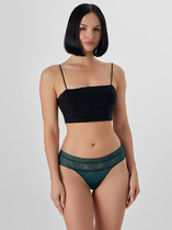 Бикини с симметричными кружевными вставками по боковым частям изделия и кружевной спинкой со средним швом. По поясу и ножке со стороны переда обработаны резинкой с фестоном.