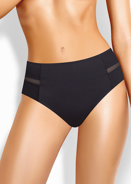 Трусы бразилиана с завышенной посадкой, сзади и сбоку бесшовная гладкая обработка, спереди декоративные горизонтальные вставки из плотной сетки, перед дублирован сеткой, по талии обработка с зигзагом и узкой резинкой