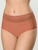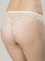 Классическая модель удобной посадки. Изделие комбинированное: перед - кружевное полотно, спинка - трикотаж. По ножкам - резинка с фестоном, по талии - отделкакружевом. На детали переда по центру - небольшой атласный бант.